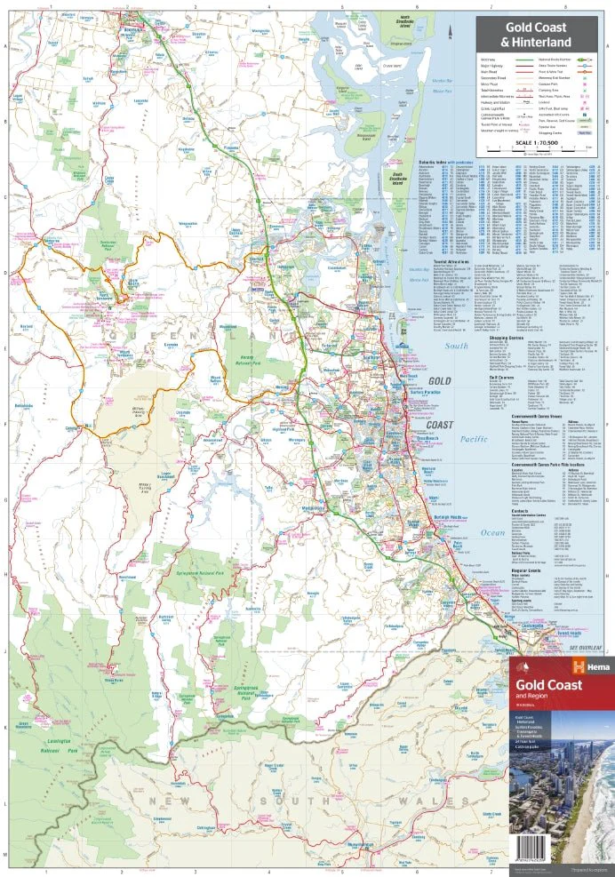 This map of the Gold Coast includes detailed mapping of the city (1:15,000) and suburbs (1:50,000), as well as a comprehensive overview of the surrounding Gold Coast Hinterland (1:100,000).