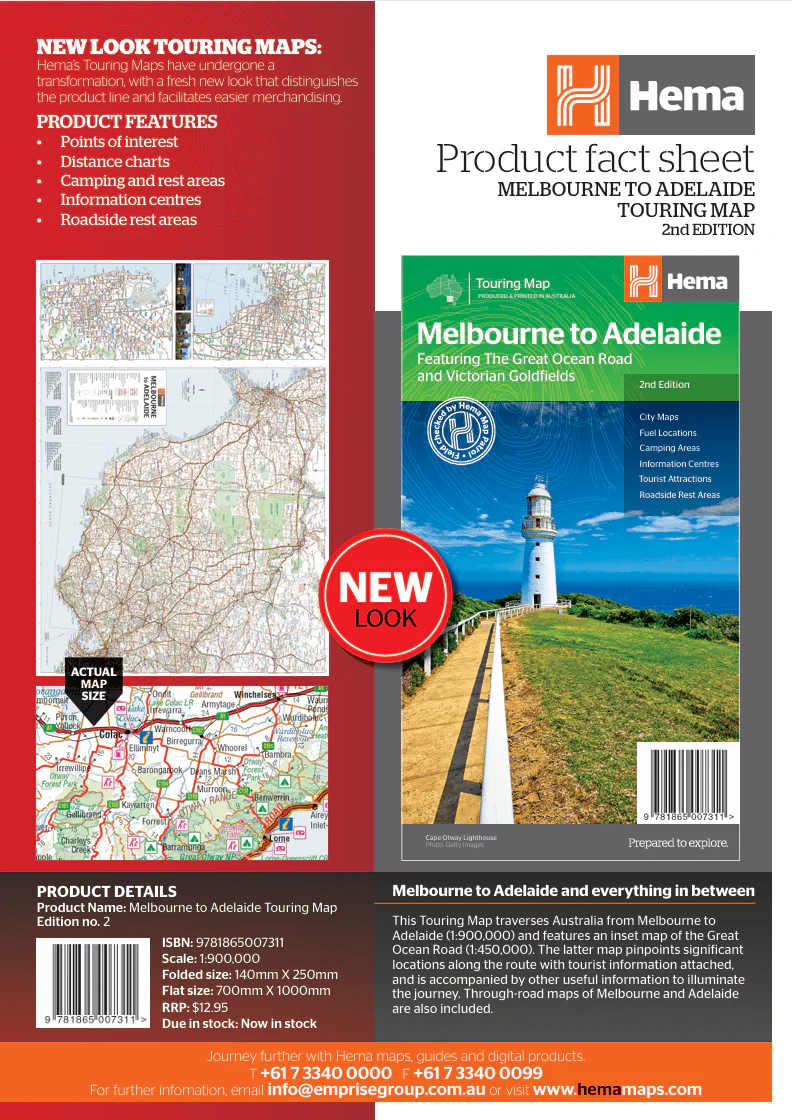 This touring map traverses Australia from Melbourne to Adelaide (1:900,000) and features an inset map of the Great Ocean Road (1:450,000). The latter map pinpoints significant locations along the route with tourist information attached and is accompanied by other useful information to illuminate the journey. Through-road maps of Melbourne to Adelaide are also included.