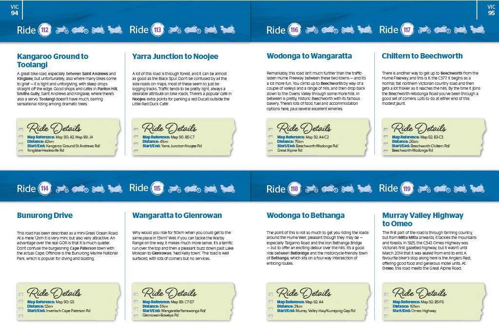 Each ride features a map reference, which corresponds to the Australia Road & 4WD Handy - 185 x 248mm. This companion product is available for purchase on the Hema Maps website or through authorized retailers.