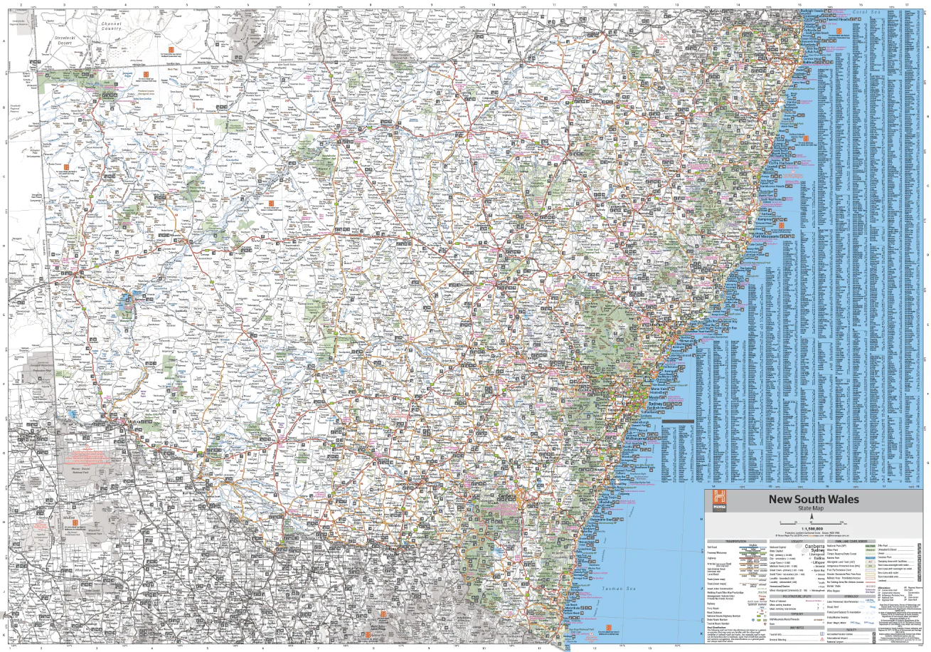 This state map of New South Wales is at a scale of 1:1,500,000 and includes national parks, points of interest, 24-hour fuel in addition to camping and rest areas. On the reverse side are through road maps of Sydney and Canberra, as well as the Sydney regional area. There is a full index included, as well as all national park information.
